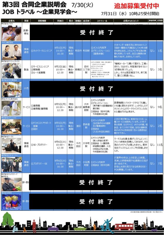 受付締切日:各企業のJOBトラベル実施日の前日18:00まで (但し、定員に達し次第、受付終了となります。)