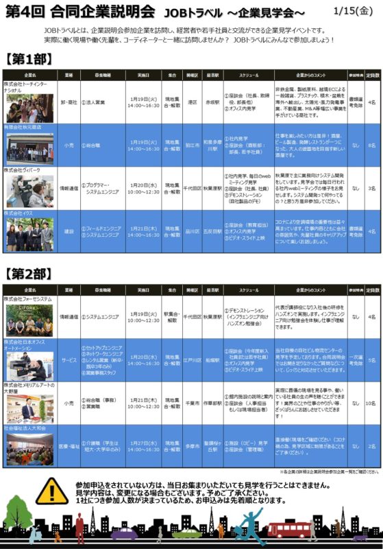 | タイトル | JOBトラベル <1/15開催 合同企業説明会 出展企業への訪問・見学会> |