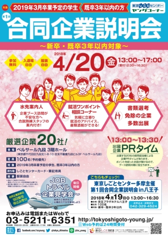 | 参加対象 | 2019年3月卒業予定の学生・既卒3年以内の方(2015年4月~2018年3月卒業の方) ※各企業の応募条件は東京しごとセンター3階ヤングコーナー内「業界職種・企業ラボ」(旧:業界職種・企業ラボ)にてご確認ください。 |